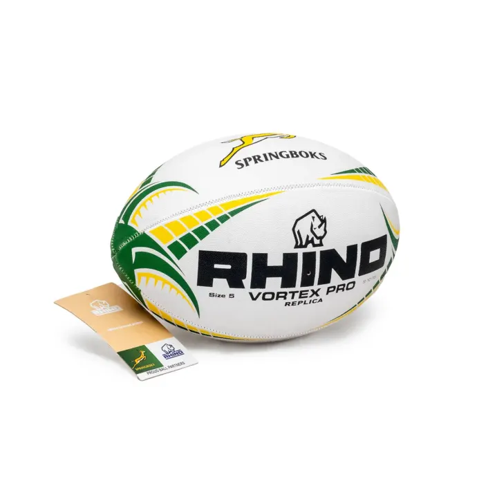 Introducing the Springboks Rhino Vortex Pro Replica Match Rugby Ball – the ideal choice for high-level training and matches. Featuring Max Multigrain grip for exceptional handling and a high-tech in-seam bladder for superior flight control. Available in size 5, it’s perfect for players aiming to perform at their best while showcasing Springboks pride on the field.